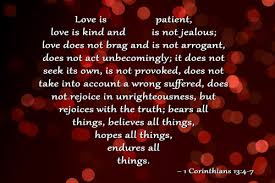 4 Love is patient, love is kind. It does not envy, it does not boast, it is not proud. 5 It does not dishonor others, it is not self-seeking, it is not easily angered, it keeps no record of wrongs. 6 Love does not delight in evil but rejoices with the truth. 7 It always protects, always trusts, always hopes, always perseveres.8 Love never fails. But where there are prophecies, they will cease; where there are tongues, they will be stilled; where there is knowledge, it will pass away. 9 For we know in part and we prophesy in part, 10 but when completeness comes, what is in part disappears. 11 When I was a child, I talked like a child, I thought like a child, I reasoned like a child. When I became a man, I put the ways of childhood behind me. 12 For now we see only a reflection as in a mirror; then we shall see face to face. Now I know in part; then I shall know fully, even as I am fully known.